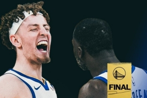 賽后,勇士官方曬出贏球海報,波杰姆斯基和追夢登上封面。