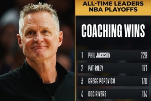 本場獲勝后,科爾季后賽執(zhí)教勝場數(shù)來到101勝,超越拉里-布朗(100),來到歷史第6位!