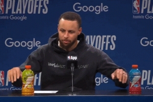 賽后,庫(kù)里出席了新聞發(fā)布會(huì)。他把2瓶佳得樂(lè)飲料放到了臺(tái)下。