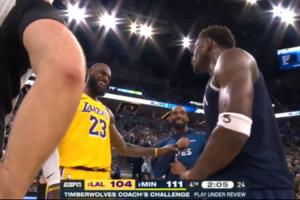 距離比賽結(jié)束還剩2分鐘時(shí),詹姆斯在一次挑戰(zhàn)期間與對手(康利和愛德華茲)的嬉鬧被媒體和球迷不斷放大,此時(shí)湖人落后森林狼7分。