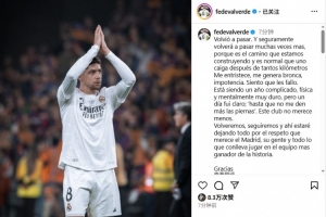 體育資訊4月27日訊 皇馬中場巴爾韋德今天在Instagram發(fā)文,鼓勵(lì)球隊(duì)。