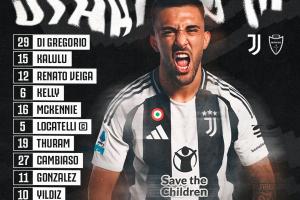 尤文首發(fā):29-迪格雷戈里奧、15-卡盧盧、12-維加、6-凱利、16-麥肯尼、5-洛卡特利、19-K-圖拉姆、27-坎比亞索、11-貢薩雷斯、10-伊爾迪茲、20-穆阿尼