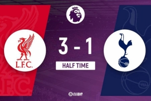 上半場傷停補時4分鐘,半場結(jié)束,利物浦暫3-1熱刺。
