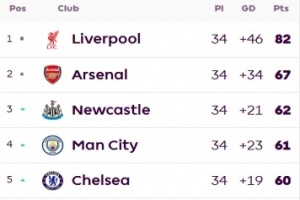 實(shí)時(shí)積分榜方面,利物浦剩余4輪領(lǐng)先第二阿森納15分,維持此比分將提前4輪奪冠。