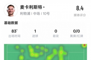 體育資訊4月28日訊 英超第34輪焦點(diǎn)戰(zhàn),利物浦對(duì)陣熱刺,麥卡利斯特首發(fā)出戰(zhàn),貢獻(xiàn)1進(jìn)球,送出2次關(guān)鍵傳球,還有6次搶斷,評(píng)分8.4。