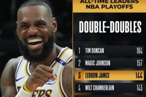據(jù)統(tǒng)計,這是詹姆斯季后賽生涯拿到的第144個兩雙,超越張伯倫獨占歷史第三,僅次于鄧肯(164)和魔術師(157)。