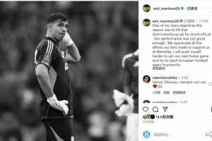 維拉門將馬丁內(nèi)斯賽后在社交媒體上寫道:“本賽季我的主要目標(biāo)之一就是為維拉贏得足總杯,但我們的表現(xiàn)不夠好。非常感謝球迷在溫布利球場對我們的支持。我會更加努力,爭取贏得下一場主場比賽,努力再次躋身歐冠賽場。”