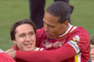 在賽后奪冠慶祝時(shí),隊(duì)長范迪克摟著基耶薩,與基耶薩聊天。