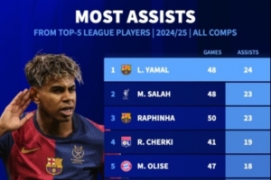 體育資訊4月28日訊 德轉(zhuǎn)列本賽季五大聯(lián)賽球員各項賽事總助攻榜,亞馬爾24次居首,薩拉赫、拉菲尼亞均23次。