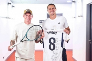 體育資訊4月28日訊 據(jù)《馬卡報(bào)》報(bào)道稱,克羅斯現(xiàn)場(chǎng)觀看了茲維列夫在馬德里大師賽的比賽,并向他贈(zèng)送了皇馬球衣。