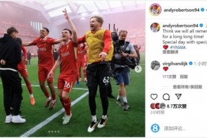 利物浦邊衛(wèi)羅伯遜社媒曬出慶祝奪冠的照片,并寫道:“昨天的回憶,我想我們都會銘記很久很久!與特別的人共度特別的一天?!?/p>