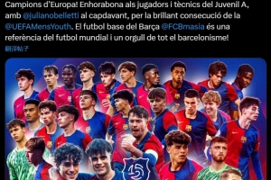 拉波爾塔寫道:“歐洲冠軍!祝賀青年A隊的球員和教練組,在朱利亞諾-貝萊蒂的帶領(lǐng)下,在青年歐冠取得如此輝煌的成就!”