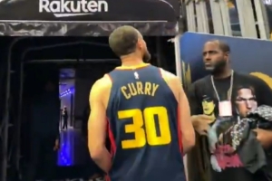賽后,庫(kù)里走回通道之前,揮舞毛巾向現(xiàn)場(chǎng)球迷致意,心情大好。