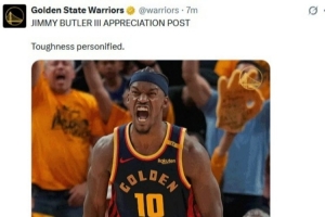 賽后,勇士官推曬照夸贊巴特勒:“這是巴特勒三世的感謝貼,他是韌性的化身?!?/p>