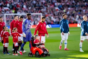 在對陣曼城的兩天前,鮑比受邀來到卡靈頓訓(xùn)練基地參加電動輪椅足球活動,并在那里驚喜地見到了B費。鮑比、他的父親特倫斯和母親克萊爾在卡靈頓等待活動開始時,B費結(jié)束了訓(xùn)練后出現(xiàn)了。
