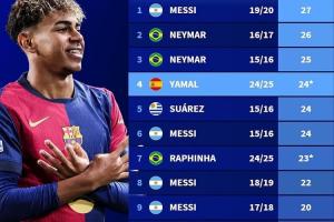 4.24-25賽季:亞馬爾24次(賽季未結(jié)束)