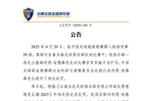 體育資訊04月29日訊 云南玉昆發(fā)布公告,對主教練安德森給予3萬元人民幣罰款處罰,對新滇軍球迷團(tuán)體主要負(fù)責(zé)人處以禁止主場入場觀賽3場處罰。