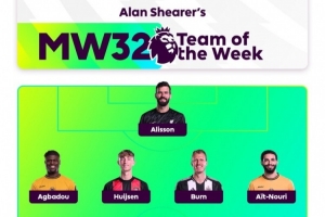體育資訊4月16日訊 英超第32輪戰(zhàn)罷,阿蘭-希勒評本輪最佳陣容,德布勞內(nèi)領(lǐng)銜,阿利森、托納利、懷森在列。