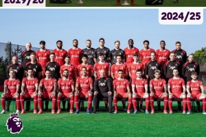 英超社媒曬出利物浦2019-2020賽季、2024-2025賽季的全家福照片,2019-2020賽季的陣容中,7名球員仍在紅軍隊(duì)中,分別是范迪克、阿利森、戈麥斯、瓊斯、阿諾德、薩拉赫、羅伯遜。