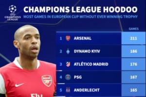 體育資訊04月30日訊 德轉(zhuǎn)在凌晨歐冠賽前統(tǒng)計了歷史上參加歐冠場次最多、但至今未奪冠的球隊排名。阿森納211場(未算凌晨比賽)歷史第一、馬競176場第3、巴黎167場第4。
