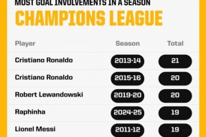 2013-14賽季,C羅在歐冠單賽季參與21粒進球,排名歷史第一,2015-16賽季,C羅歐冠單賽季參與20球,與2019-20賽季的萊萬并列,拉菲尼亞本賽季歐冠到目前為止已經(jīng)參與19粒進球,追平2011-12賽季的梅西。