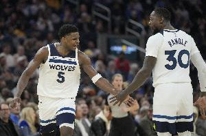 森林狼首發(fā)沒有變化,依舊是:麥克丹尼爾斯、蘭德爾、戈貝爾、愛德華茲、康利。