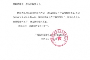 體育資訊5月1日訊 中乙廣西藍航官方消息,與主教練宮磊解除執(zhí)教合同。