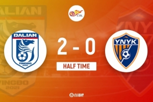 傷停補(bǔ)時(shí)5分鐘。上半場(chǎng)比賽結(jié)束,大連英博2-0云南玉昆。