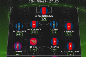體育資訊5月1日訊 歐冠半決賽首回合比賽戰(zhàn)罷,WhoScored列出最佳陣容,亞馬爾、登貝萊、賴斯在列,巴黎6名球員入選。