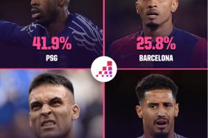 巴黎以41.9%成為奪冠最大熱門,巴薩25.8%第二,國(guó)米20.2%,阿森納12.1%。