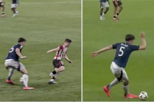 第30分鐘,馬奎爾面對畢爾巴鄂競技中場豪雷吉扎爾,連續(xù)扣球后傳中,烏加特前點頭球擺渡,卡塞米羅頭球接力破門。