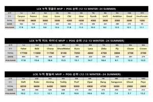 體育資訊5月2日訊 近日,韓網(wǎng)有網(wǎng)友統(tǒng)計(jì)了LCK歷史MVP(最有價(jià)值選手)和 POG(當(dāng)場(chǎng)最佳選手)積分?jǐn)?shù)據(jù)。
