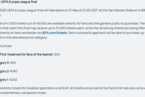 英國記者Simon Stone在社交媒體上曬出了歐聯(lián)杯決賽的球票價格,最低票價為40歐元,最高票價為240歐元。