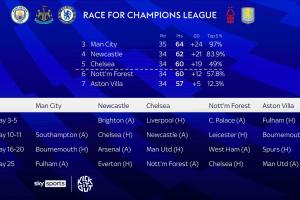 目前排名英超第4的紐卡前五概率達到83.9%。排名第4的切爾西前五概率49%反而低于目前第5的森林(賽程原因)。維拉則是僅有12.3%的概率排前五。