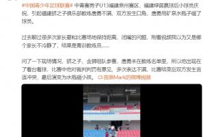苗原寫(xiě)道:中青賽男子U13福建泉州賽區(qū),福建綠茵贏球后小球員慶祝,引起福建驕之子俱樂(lè)部教練唐勇不滿,雙方發(fā)生口角,唐勇用礦泉水瓶子砸了球員。