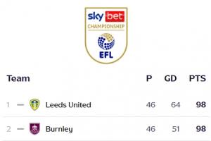 利茲聯(lián)下半場依靠尼翁托扳平比分,實時積分98分,凈勝球優(yōu)勢重回榜首!按照目前的比分,利茲聯(lián)將奪得英冠冠軍。