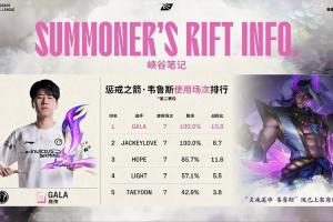 體育資訊5月3日訊 LPL登峰組TES交手iG首局落敗,而第一局TES選出韋魯斯,至此LPL第二階段僅剩GALA的韋魯斯勝利保持100%。