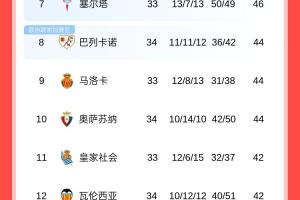 積分榜方面,巴薩以79分領(lǐng)跑,領(lǐng)先未賽的皇馬7分?;蜀R本輪將主場迎戰(zhàn)塞爾塔。