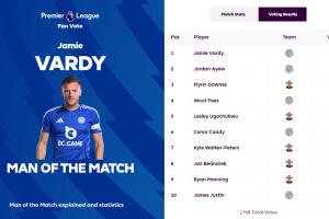 英超官方宣布,瓦爾迪當(dāng)選萊斯特城vs南安普頓球迷票選全場最佳球員。