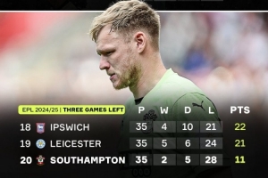 此役過后,南安普頓2勝5平28負(fù)積11分,仍與德比郡2007-2008創(chuàng)造的英超最低積分紀(jì)錄持平,南安普頓本賽季剩下三輪比賽的對手是曼城、埃弗頓和阿森納。