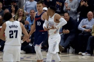 威少底角遠(yuǎn)射讓掘金領(lǐng)先,之后面投祖巴茨,破了快船的針對(duì)性放空。