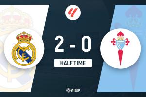 上半場比賽結(jié)束,皇家馬德里主場暫時2-0領(lǐng)先塞爾塔。