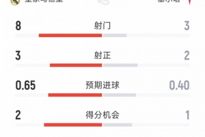 體育資訊5月4日訊 本輪西甲皇馬對陣塞爾塔上半場結(jié)束,皇馬暫時2-0領(lǐng)先,以下為雙方半場數(shù)據(jù)對比: