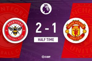 上半場傷停補(bǔ)時(shí)3分鐘,半場結(jié)束,曼聯(lián)暫1-2布倫特福德。