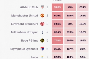 畢爾巴鄂——半決賽76.8%——決賽43%——奪冠25.1%