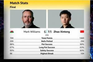 體育資訊05月05日訊 2025年斯諾克世錦賽決賽,第二階段戰(zhàn)罷,趙心童11-6馬克-威廉姆斯。