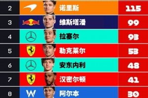 本站過后,車手積分榜方面,兩位邁凱倫車手皮亞斯特里和諾里斯排名車手積分榜前2,其中皮亞斯特里131分領(lǐng)跑,諾里斯115分排名次席,維斯塔潘、拉塞爾、勒克萊爾位列車手積分榜3-5名。6-10名的車手是安東內(nèi)利、漢密爾頓、阿爾本、奧康、斯托爾。