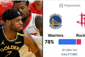 數(shù)據(jù)媒體Polymarket Sports更新了本輪系列賽晉級勝率,其中勇士高達(dá)78%,火箭僅為22%。