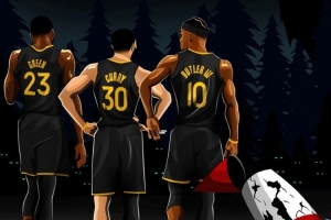 賽后,勇士官推制作海報,庫里追夢巴特勒登封面,眺望遠(yuǎn)方的狼(森林狼),而火箭被干翻在地。