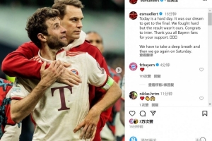 穆勒社媒寫道:“今天是艱難的一天。我們的夢想是進(jìn)入決賽,我們拼盡全力,但勝利不屬于我們。祝賀國米,感謝所有拜仁球迷的支持?!?/p>